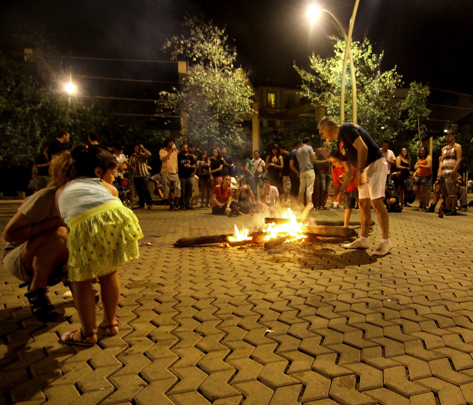 ... ayer noche volvió a ocurrir. Muchas personas pasaban por la plaza buscando la hoguera, que todavía no estaba. Como si fuera el salto de la reja, no se sabe cuando sería, quien daría el salto, pero transcurrida la medianoche, en un lugar similar al de años anteriores, alguien la inició. Se utilizó, para nuestro malestar, los palos tutores de los fresnos que sembramos y algunos otros de otros árboles... a partir de ahí la gente iba y venía a la hoguera, vecinos, vecinas, visitantes de la plaza, niños, niñas...