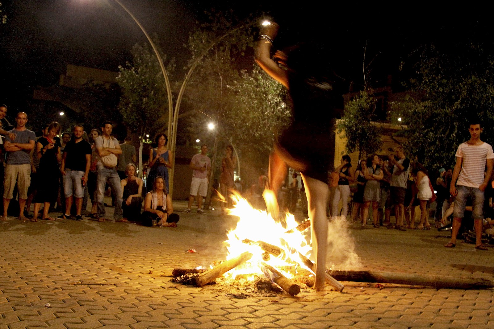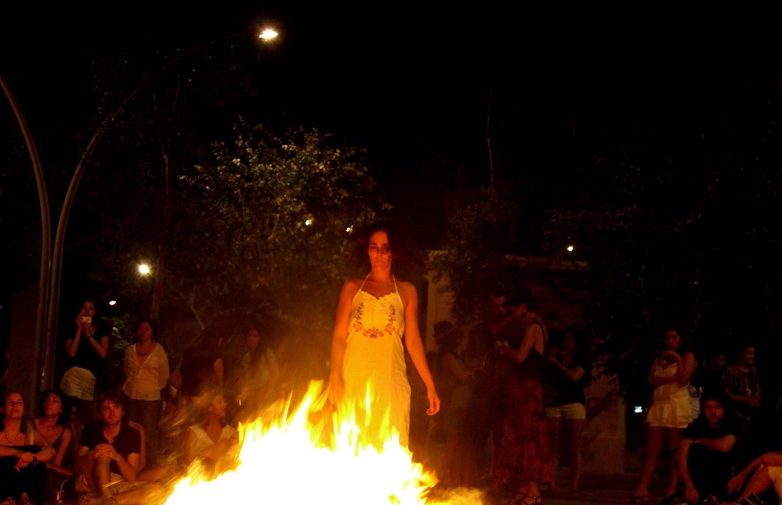 ... a partir de ahí se fue generando un muy buen ambiente: personas que se sentaba absortas por el fuego, saltos sobre la hoguera, papeles arrojados a la misma. Evidentemente, al ser algo espontáneo nadie había solicitado autorización, ni el Distrito había tenido le previsión, como si ocurrió algún año más atrás, de instalar alguna chapa sobre la que hacer el fuego y no se dejara huella en el pavimento...